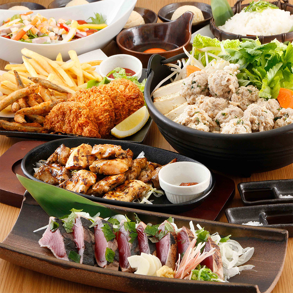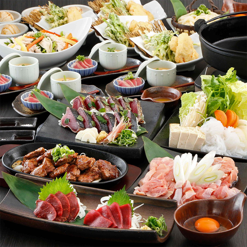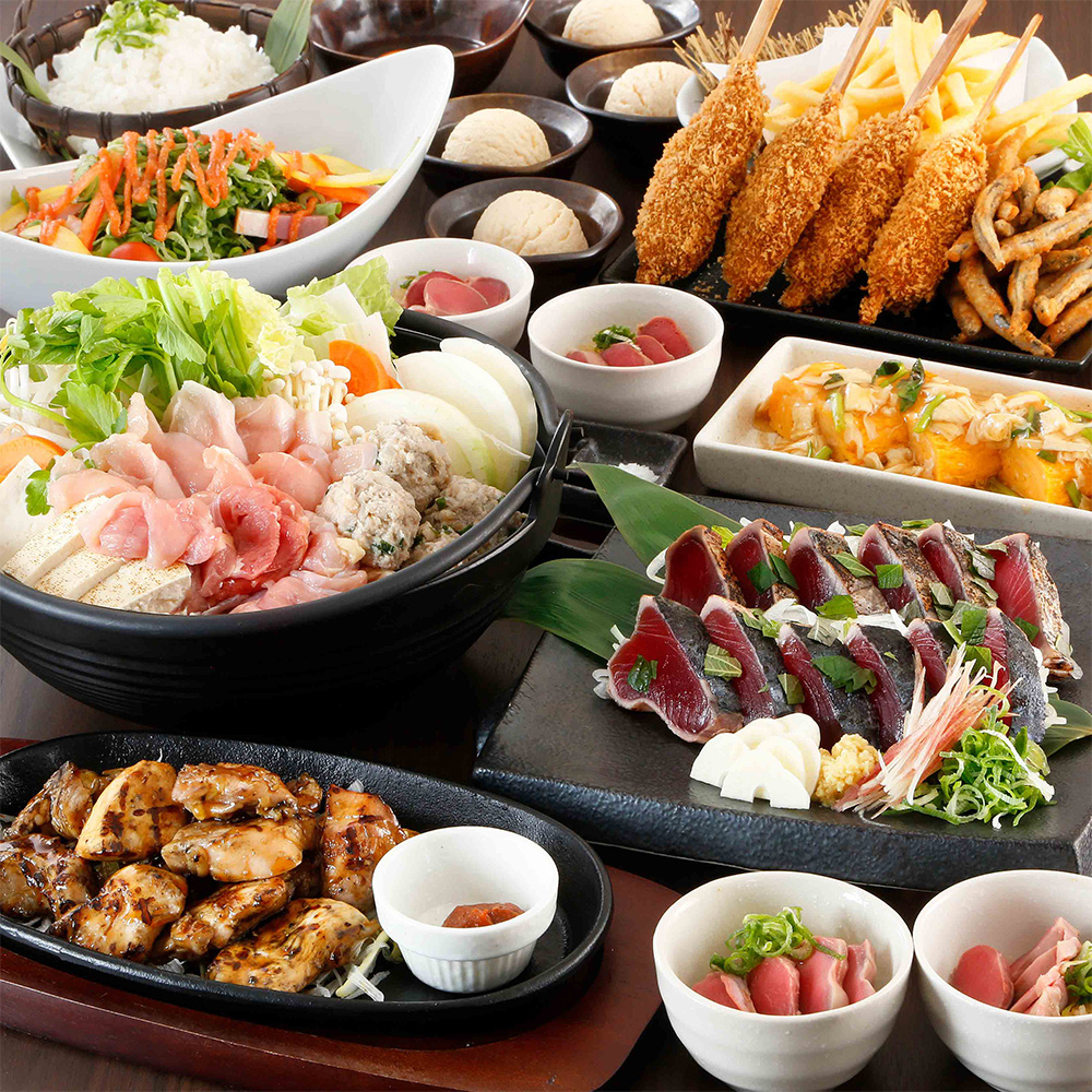 【海援隊コース】上鰹のタタキや軍鶏の水炊き・軍鶏つくねの串カツ等全9品3,500円(税込)
