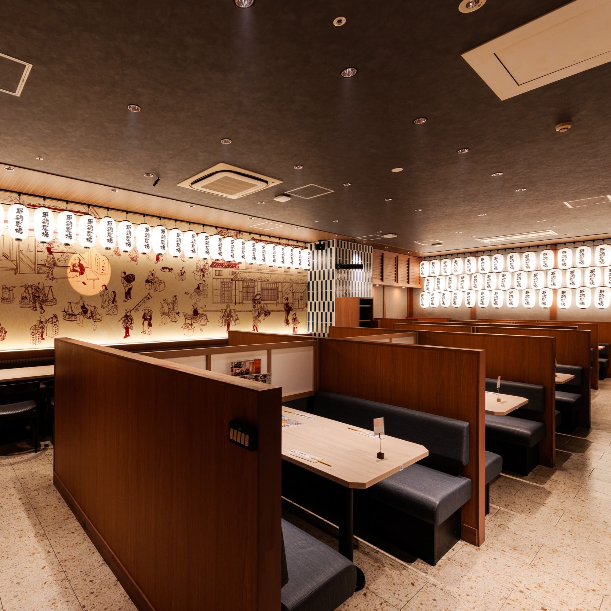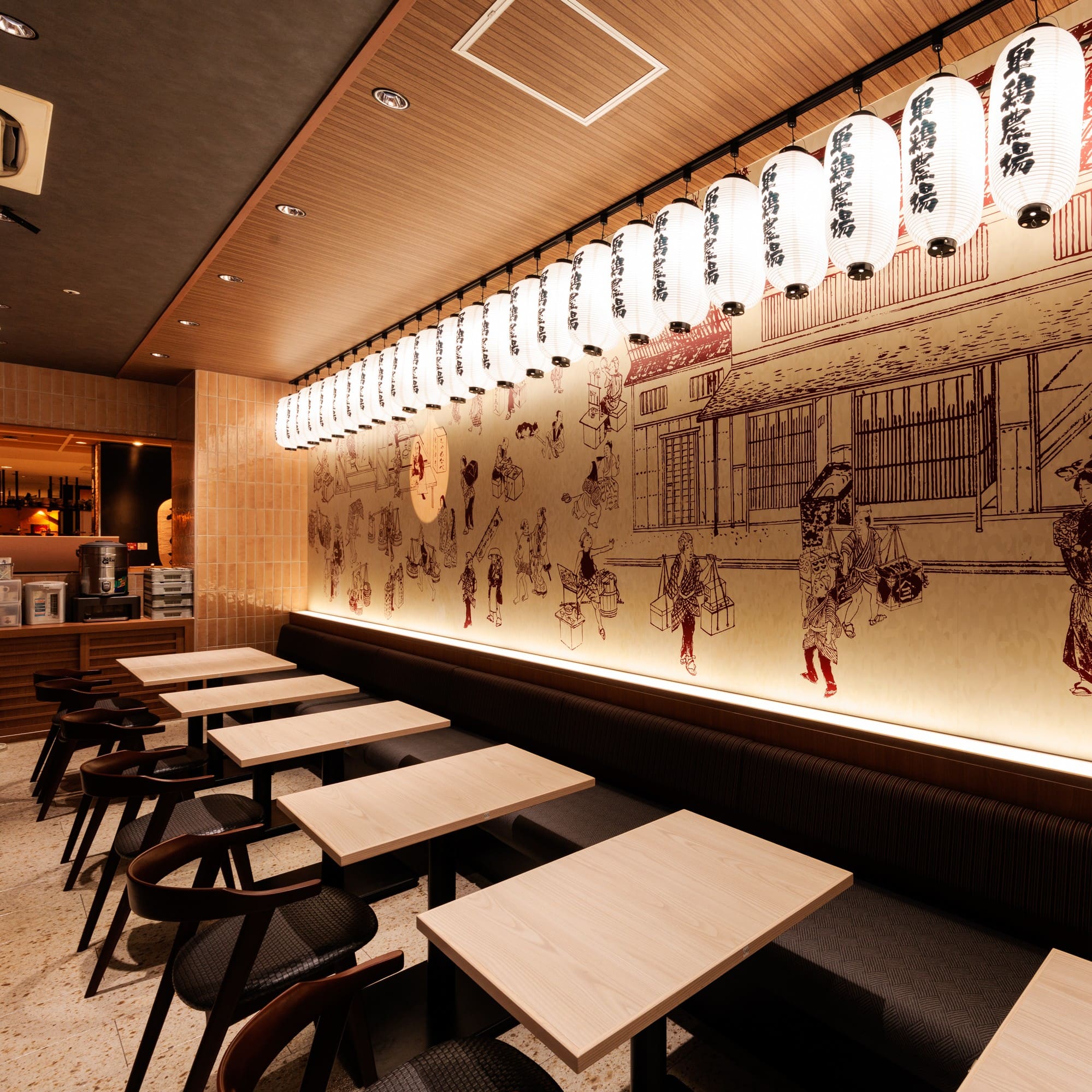 【和食居酒屋でゆったりランチ会】落ち着いた雰囲気の中、家族や友人との昼食に、定食スタイルで楽しめる軍鶏炭火焼はいかがですか?仕切り付きのテーブル席は周りの目を気にせず、お食事をお楽しみいただけます。プライベート感を大切にした空間で軍鶏ランチを満喫。