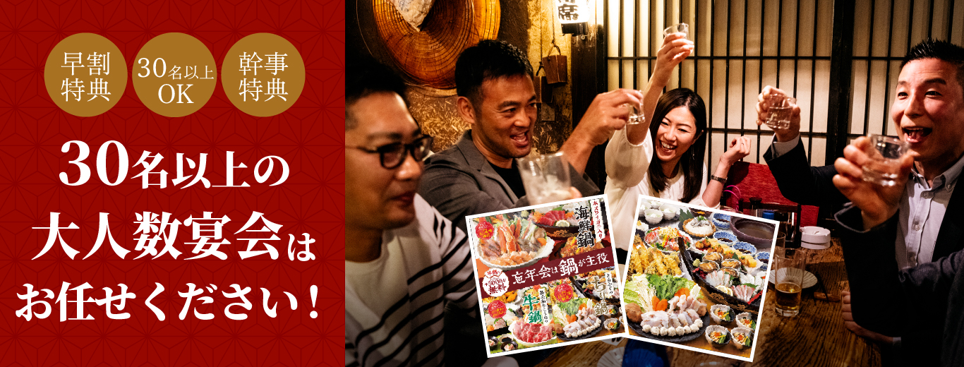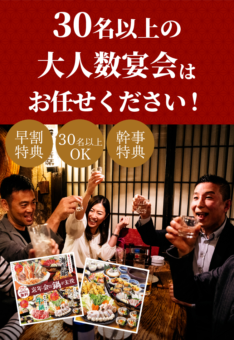 【今だけの特典満載!】30名以上の大人数の宴会もご予約承ります!